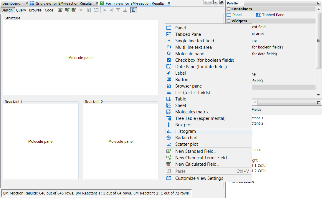 Bind the result structure to the results structure and the two reactant structures to the relevant reactant structures by using the "Bind widget to field" menu item in the right-click menu of the widgets