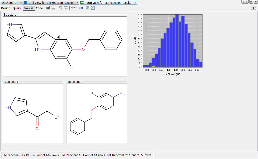 In this section you will learn how to visualize the results of the reaction enumeration along with the input reactants. It will be shown, how to set up a relationship between the products table and the reactant tables. The tutorial will also guide you through the steps of creating an appropriate form view to visualize your results.
