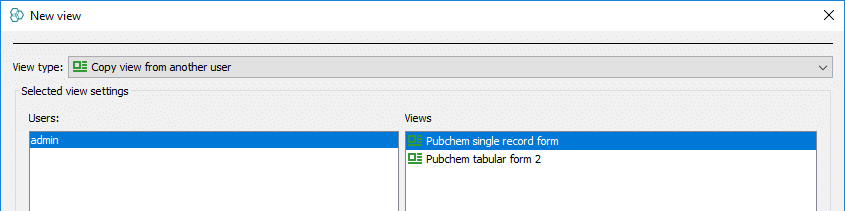 - Public (default). Item is owned by you but can be copied by at least some users which have a required role. It can be copied in "create new view" dialog by selecting "Copy view from another user" option the list of available views appears.