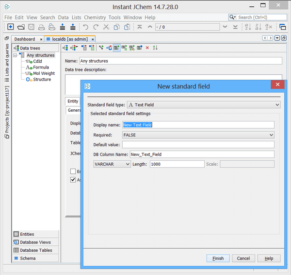 First, we need to administer a JChem table. One method to do this is via Instant JChem (IJC) Desktop application. Assuming we have an existing Derby connection / schema established in IJC then we can add a new JChem table easily. Right click on your schema and choose "new structure entity table". At the entity type drop down choose "New structure entity (using JChemBase table)". Assuming we accept the defaults - we should see the window below and the subsequent examples assume a table name of "STRUCTURES"