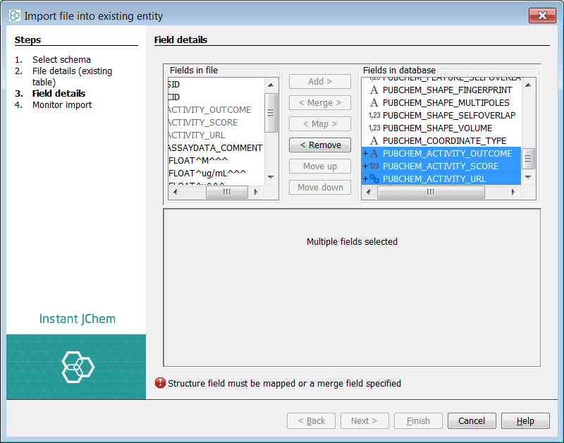 In the project explorer window, right click on the new entity named "PubChem_01ConfPerCmpd" and select Import File Into X.. .. Select the first of the CSV files you have downloaded and unzipped and then select next. First use the remove button to remove all suggested new fields . Next select the fields "PUBCHEM_ACTIVITY_OUTCOME", "PUBCHEM_ACTIVITY_SCORE" and "PUBCHEM_ACTIVITY_URL" and press Add button. Finally select "PUBCHEM_CID" in the source and the merge field "PUBCHEM_COMPOUND_CID" and choose the Merge button. Notice the double headed arrow which indicates a merge mapping. Further note, if you find the merge button is not highlighted it is quite likely you have selected more than one field on each side. Select next and the first merge iteration (with field creation) will commence. If we examine the "PubChem_01ConfPerCmpd" entity we can see three new fields added.