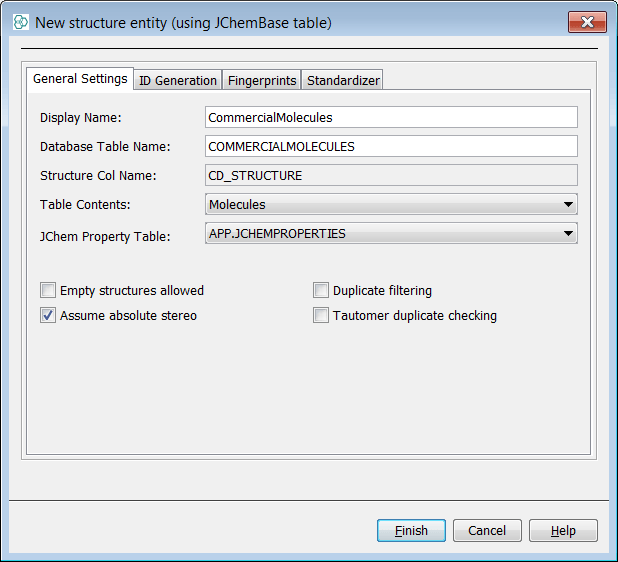 Using the preferred method, create a data tree with a root node named "CommercialMolecules". In this example notice we have deliberately left the duplicates tick box off and so we will allow duplicate structures in this entity.