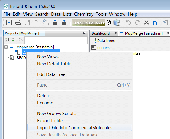 Next we can process the next SDF file, 'Asinex Elite'. Right click on the root node and select Import File Into X.. . and select the file to import.