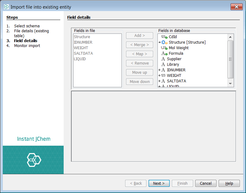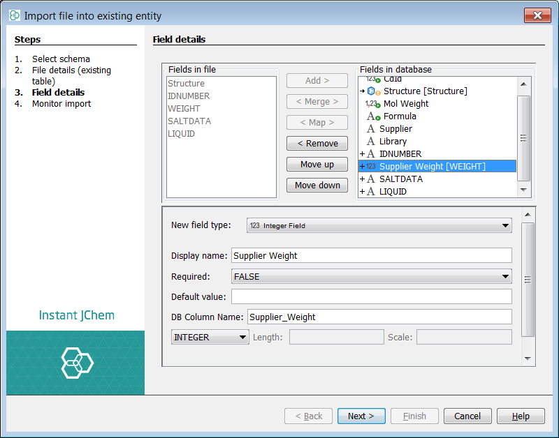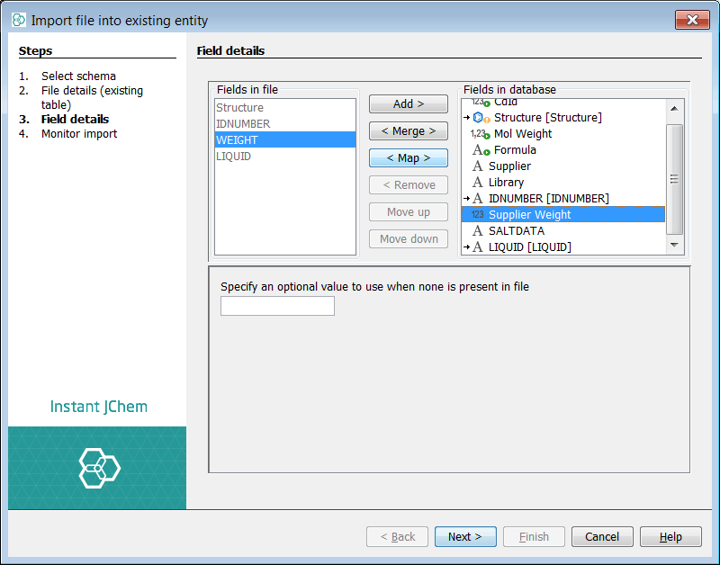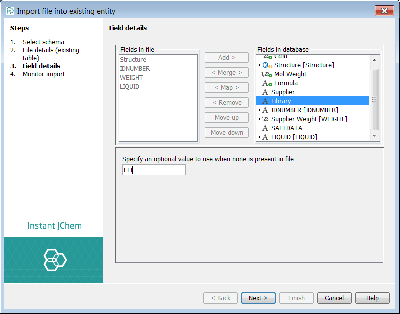 You can now see two lists of fields. The left list shows the potential fields from the source file. The right list shows the current and potential structure of the target entity. The Structure (ctab) from the file is automatically mapped to the structure column of the entity. The auto populated fields (green arrow) are visible and cannot be mapped to, if you select one no options are available. The two additional existing fields added above, are visible with no mapping. At this stage you can also specify a default value for these fields. For the purposes of demonstration we will set values here also. IJC has suggested 3 new fields to add, indicated by the sign.