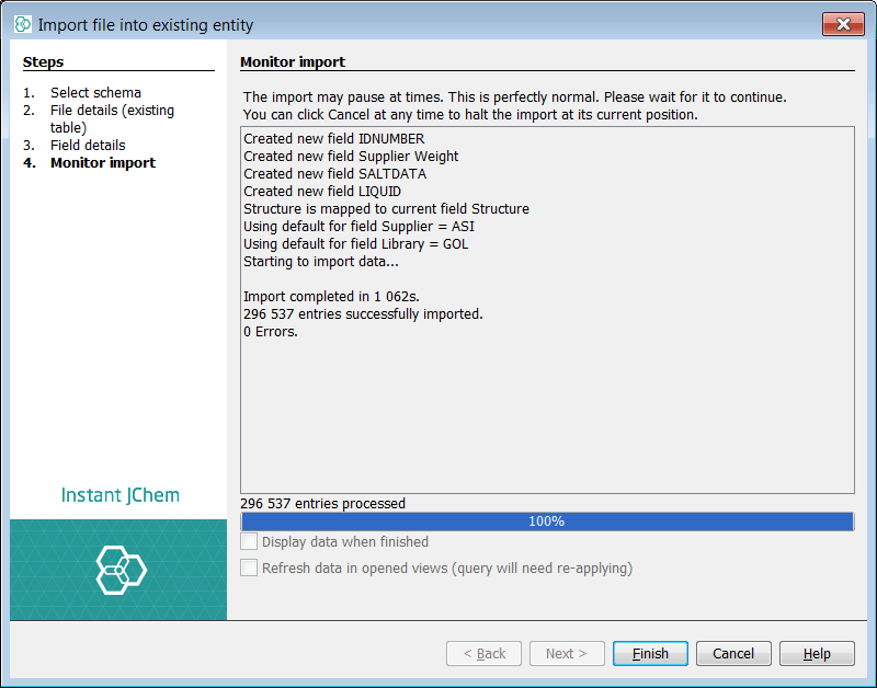 Select next and the import will commence. Once complete select finish. You can see that Instant JChem has imported ~300K records in a matter of minutes.