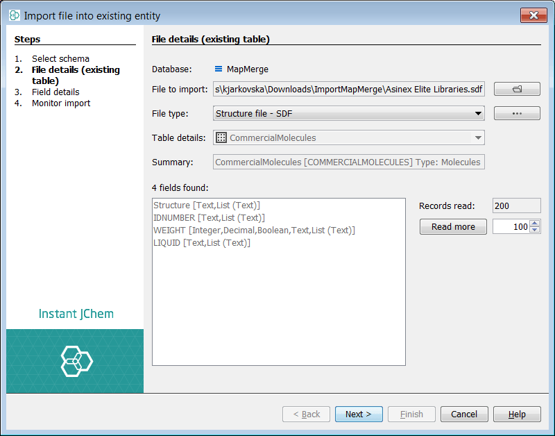 Next, we will complete a simple import and map some new fields found in the first input SDF file 'Asinex Gold-Platinum'. Right click on the root node and select Import File Into X.. . and select the file to import. The first dialog lists the potential fields found in the source SDF file. Press the 'Read more' button in order to examine later records in the file for more fields to add. Once satisfied, select next and the next dialog appears.