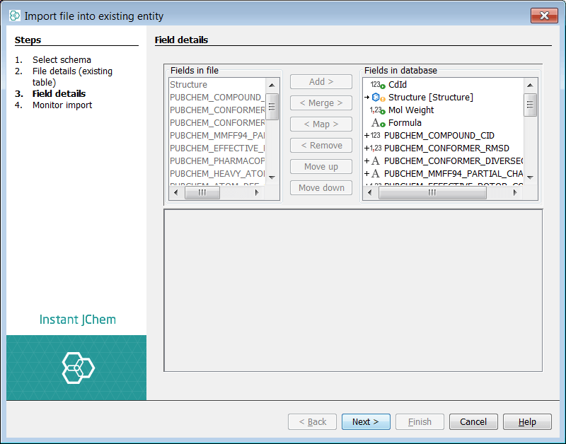 In the project explorer window, right click on the new entity named "PubChem_01ConfPerCmpd" and select Import File Into X.. .. Select the first of the SDF files you have downloaded and unzipped and then select next. You can see a new dialog now that lists source fields and potential new fields in your target entity. For now we will accept all as new fields and create all new suggested fields that available in the source SDF. Once complete, select Finish .