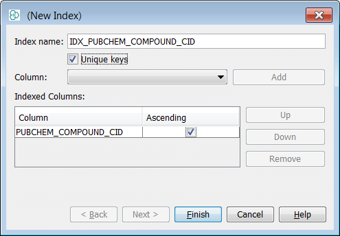 Right click on the schema node and select Edit schema and the schema editor will open. At the entity level expand the description of the entity "PubChem_01ConfPerCmpd" and right click on the field "PUBCHEM_COMPOUND_CID" and select New Index . Rename your index if you wish and ensure the unique keys tick box is checked on - select Finish .