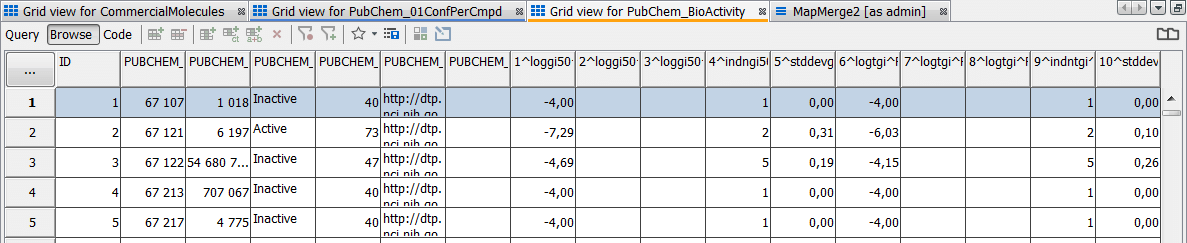 Open up a grid view in your new standard data tree and examine the first few rows. In this example we will retain fields 3, 4 and 5 which are named "PUBCHEM_ACTIVITY_OUTCOME", "PUBCHEM_ACTIVITY_SCORE" and "PUBCHEM_ACTIVITY_URL" and we will merge bases in field 2 "PUBCHEM_CID".