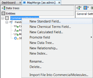 You now have a 'vanilla' structures table. Next right click on the data tree and select Edit data tree and you will open the schema editor. At the entities level right click on the entity and select New standard field . Select a text field, name the new field 'Supplier', set the default value to 'ASI' and the field size to 3. At the entities level right click on the entity and select New standard field . Select a text field, name the new field to 'library', set the default value to 'GOL' and the field size to 3. You can also set default values at import time which you can see below. Now we will import the first commercial supplier SDF library 'Asinex Gold'.