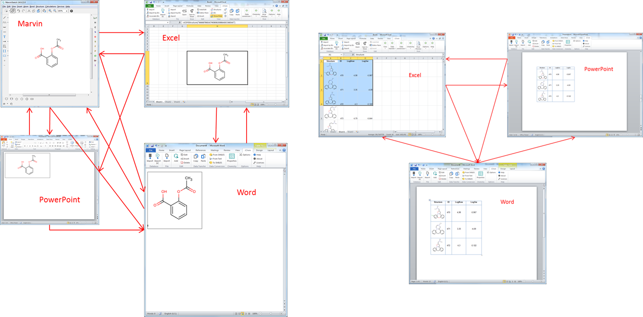 Data, including structural information in Microsoft Office applications, can be copied and pasted inside and between MS Office applications and external structure editors.