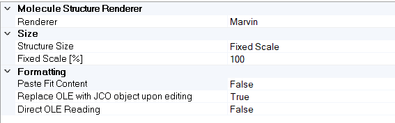 This option provides the possibility to process Microsoft Office documents containing Marvin OLE objects without the Marvin OLE server. When the proper redirection from ISIS and ChemDraw objects has been set, ISIS and ChemDraw OLE objects can be processed as well. Setting this option to TRUE will obtain the chemical structure directly from the OLE object during the conversion to JChem for Office object.