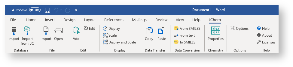 After installing JChem for Office, the JChem ribbon becomes available in Microsoft Office applications. Use the ribbon buttons to access the various functions of JChem for Office.