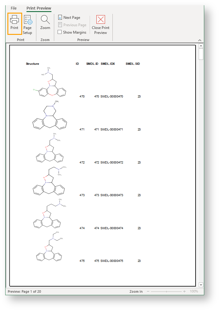 It is possible to print JChem for Excel files in the following ways: