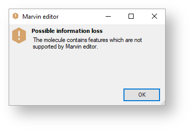 A warning appears stating that some ChemDraw-specific functions are not yet supported in MarvinSketch.