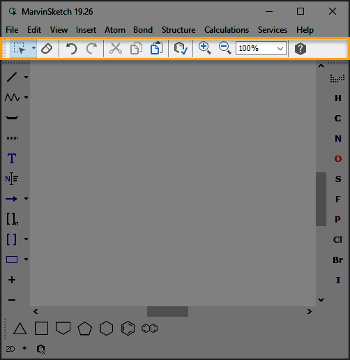 Zoom Tool Zoom tool icon Changes the magnification of the canvas to a specific value. It can also do autoscale using the following named values: All, Selection, Scaffold (only when an R-group is defined on the canvas), and R-group (only when an R-group is defined on the canvas)