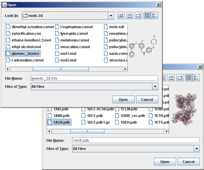 In this example, we use Marvin as a custom accessory component of a file chooser to provide a preview to molecule files.