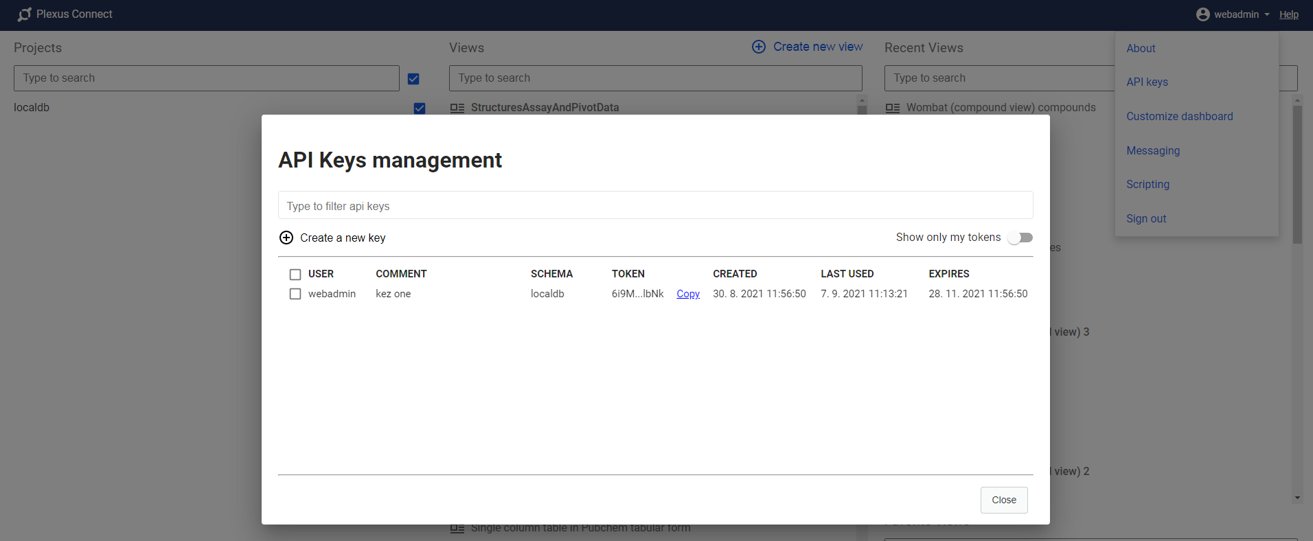 User, who wants to use his API key, has to copy the key value from the API key Management dialog in the Connect UI.