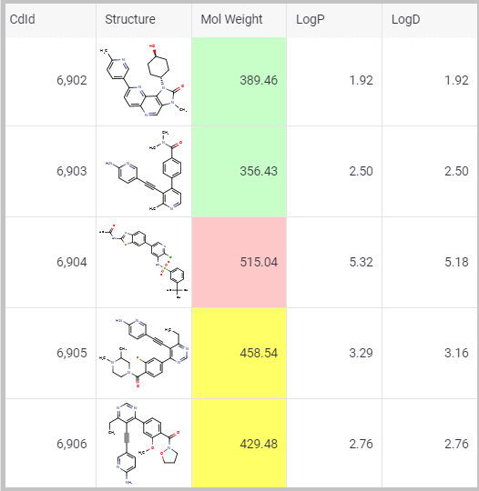 By clicking ‘Confirm’ the conditional formatting rules are applied to the Mol Weight column.