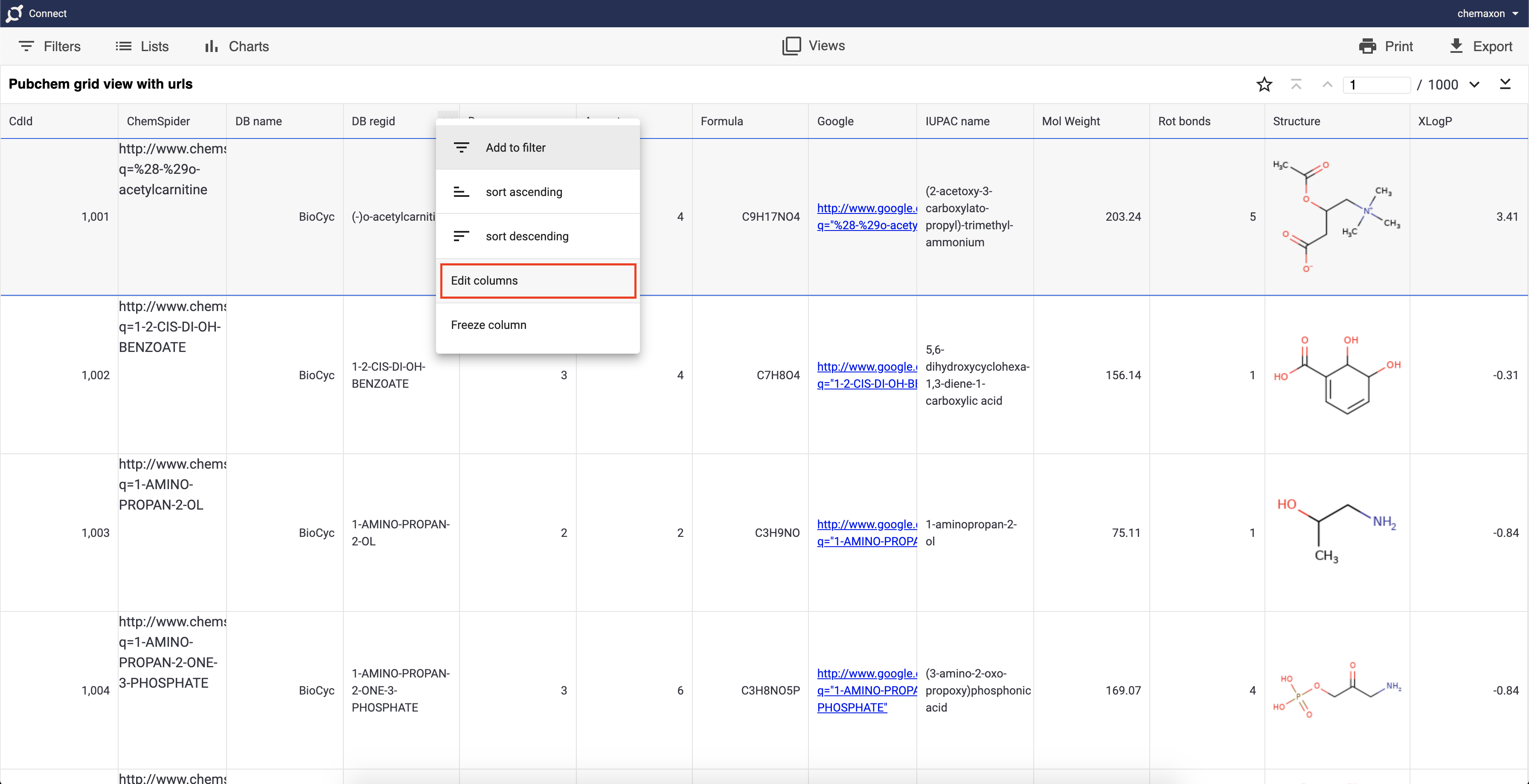 ) appears when the opened view is owned by you and allows you to open your view in Instant JChem (more details about handling Plexus Connect views in IJC can be found on this page). The star icon allows you to bookmark any opened view. The bookmarked view then appears in the Favorite Views section of Plexus Connect dashboard.