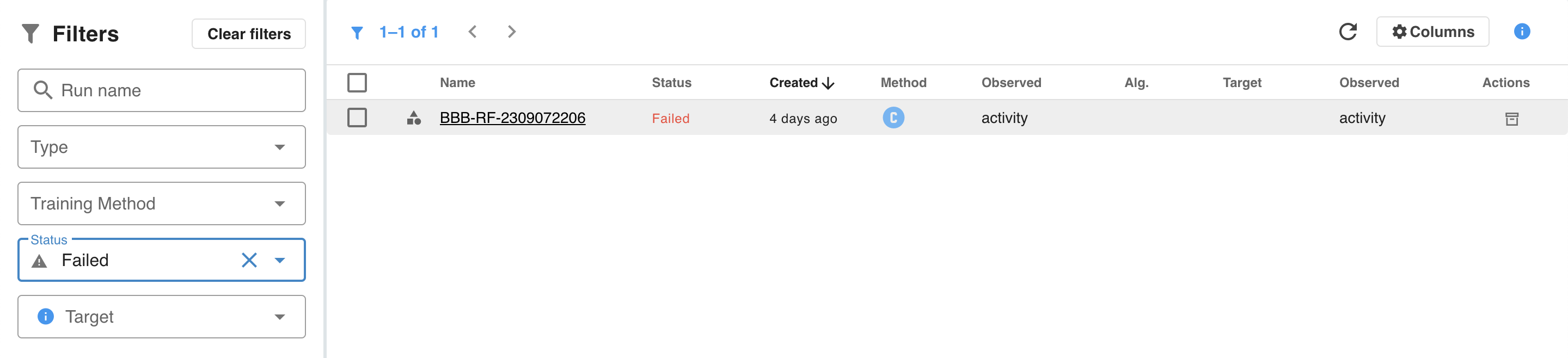 Runs can also be filtered based on their status. The following statuses are defined: Running, Waiting, Failed, Orphaned, Cancelled and Success.