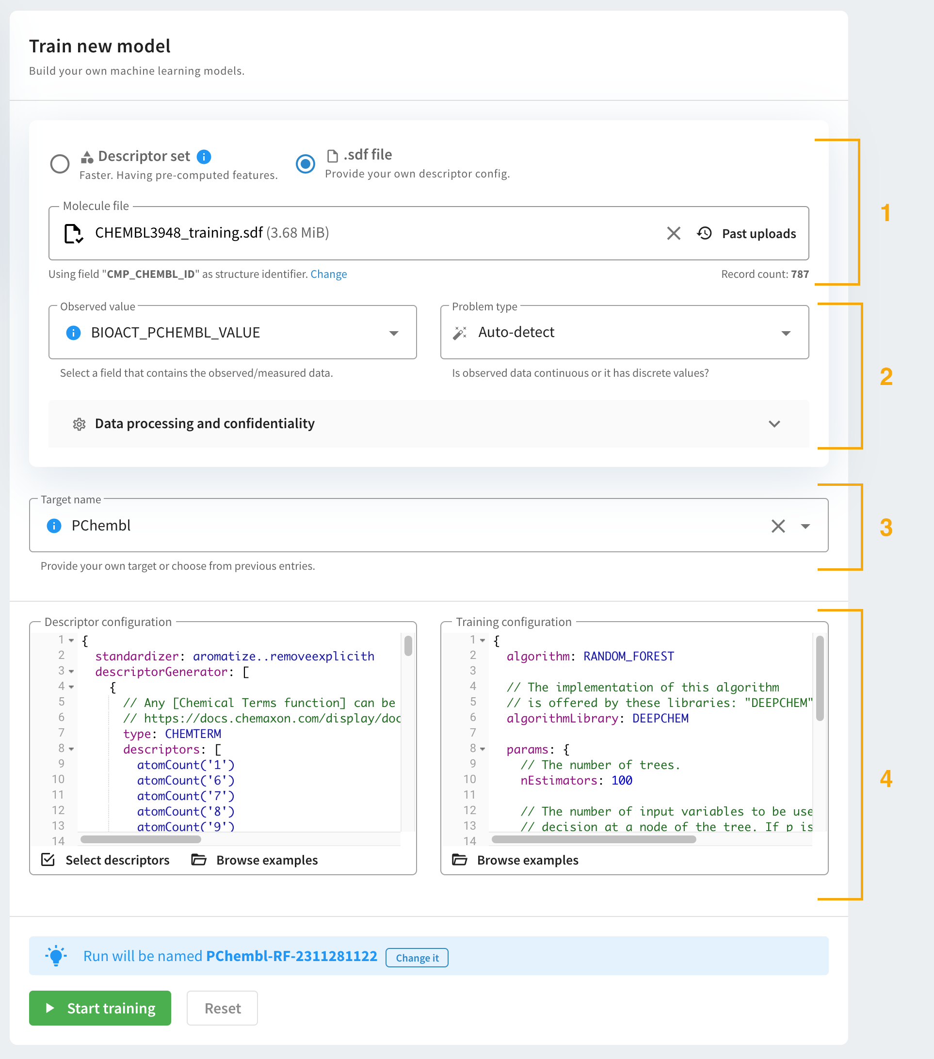 Upload an input file. The supported file format is .sdf, with labeled data stored in a mandatory sdf field. Also, set the Observed value and Target name fields.