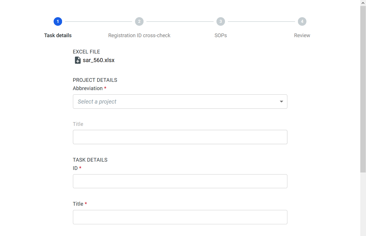 Required fields are Project Abbreviation (Project Title is filled in based on your project selection), Task ID, Task Title and the Task Owner Group (if applicable). The Project Abbreviation has to be selected from a list of existing projects which has to be set up within Chemaxon Cloud. Contact your administrator if you don't find a matching project ID. These data is needed to identify the task precisely, so fill in carefully.