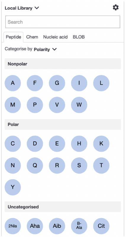 To change or remove the monomer grouping on the library panel, click on the property’s name and select another property or ’None’ in the list.