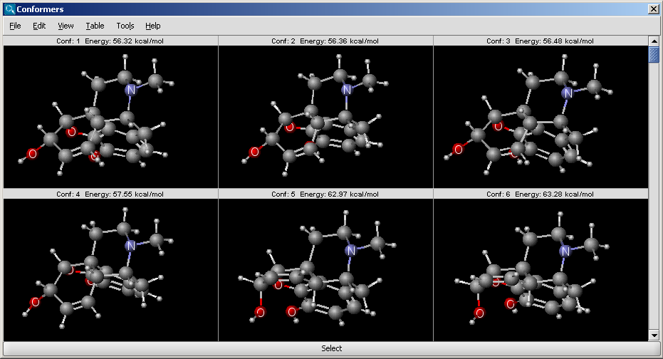The results appear in a new window, containing all calculated conformers in 3D with their energy.