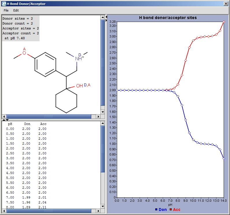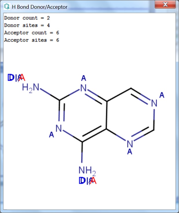 The Hydrogen Bond Donor/Acceptor Plugin calculates the hydrogen bond donor and acceptor properties of the atoms in the molecule. Atomic data and overall hydrogen bond donor and acceptor multiplicity are displayed for the corresponding atoms of the input molecule (or its microspecies at a given pH).