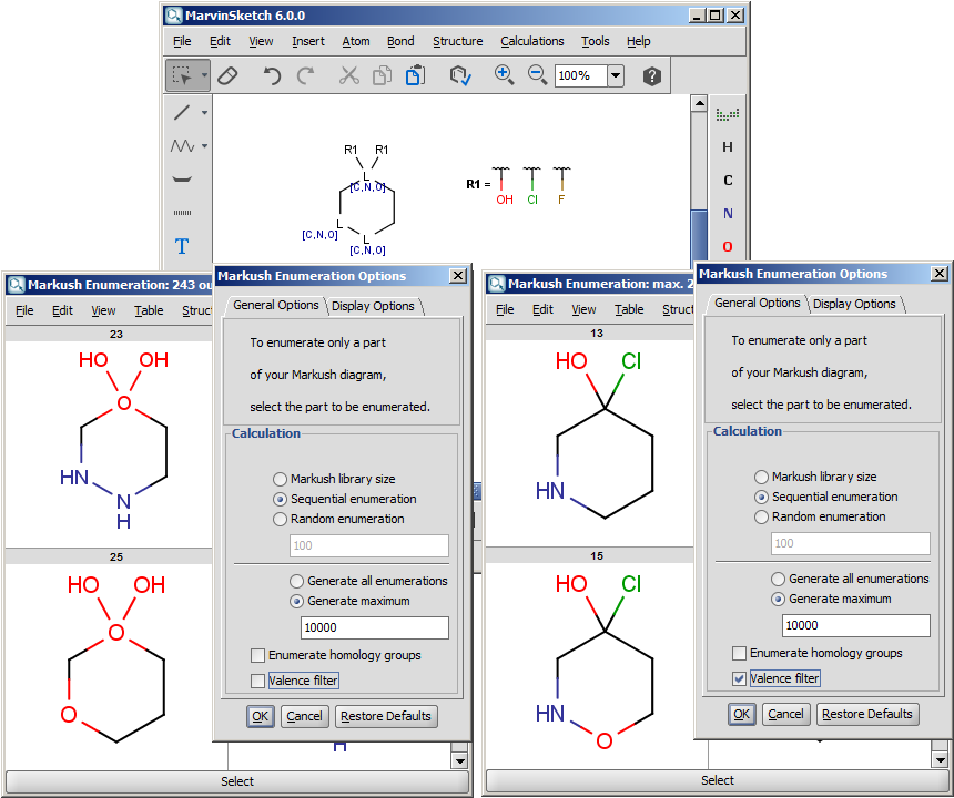 If the Markush structure is not properly (or too generally) formulated, it is possible that it describes structures with valence errors. In this case, the valence filter setting is useful to filter out the offending result structures. The default value is off (no filtering).