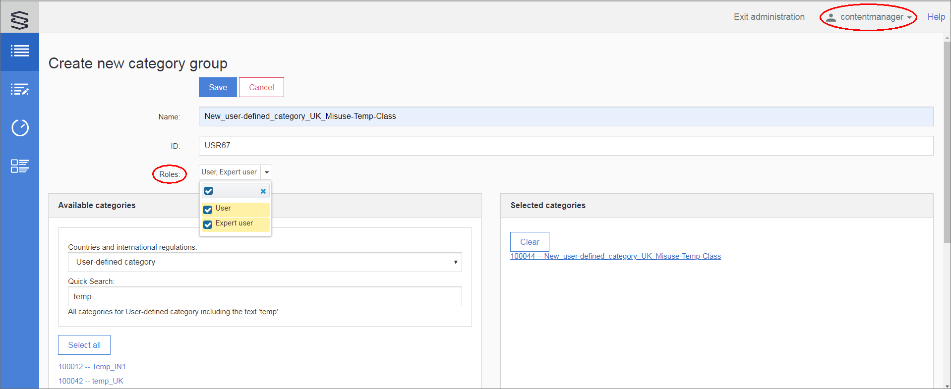 In the above example the new category's name is " New_user-defined_category_UK_Misuse-Temp-Class ", the ID is added automatically (but can be edited), the access is allowed for all user Roles , Available categories are filtered from User-defined categories by the "temp" Quick search filter and the " New_user-defined_category_UK_Misuse-Temp-Class " is in the Selected categories.