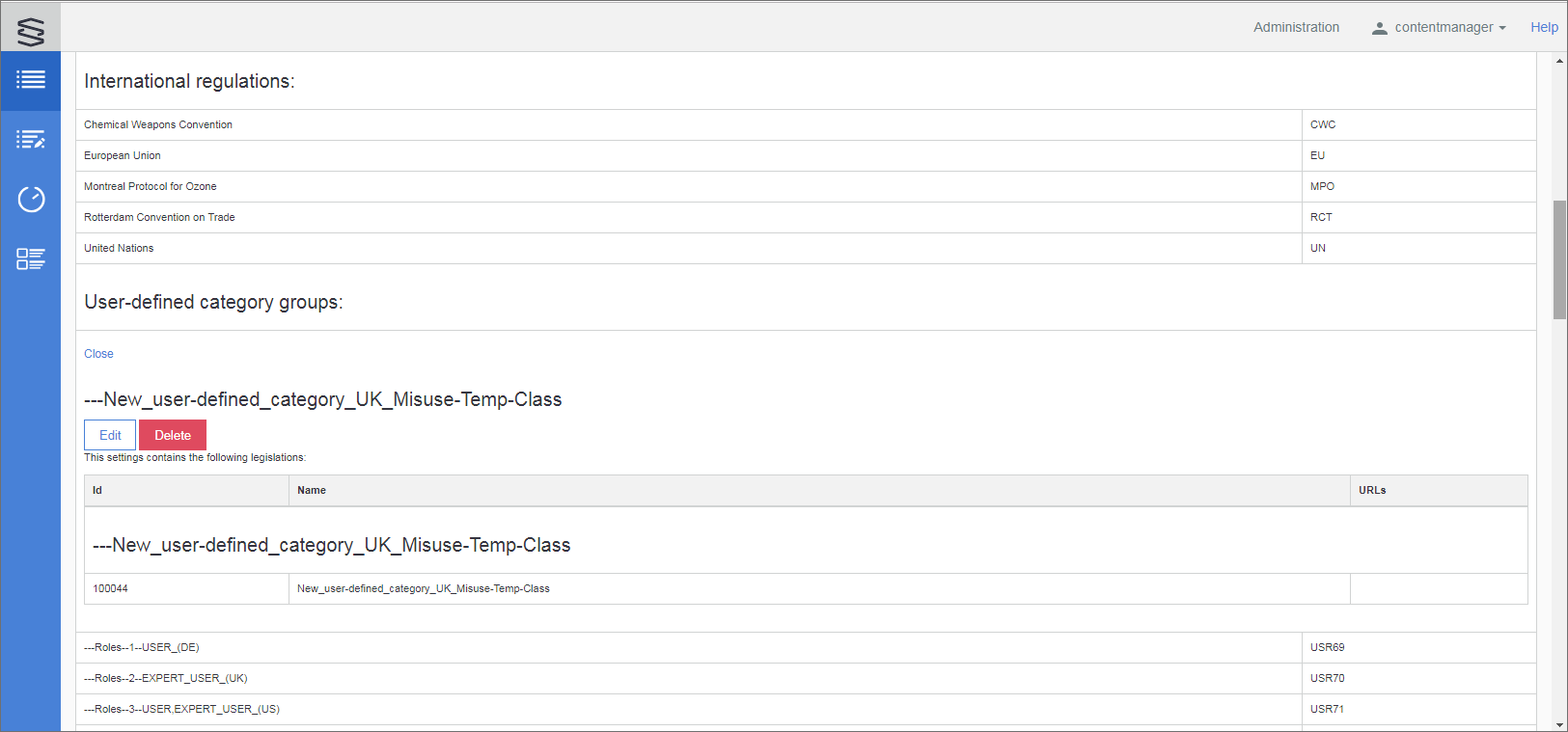 Editing or deleting 'International regulations' is not available.