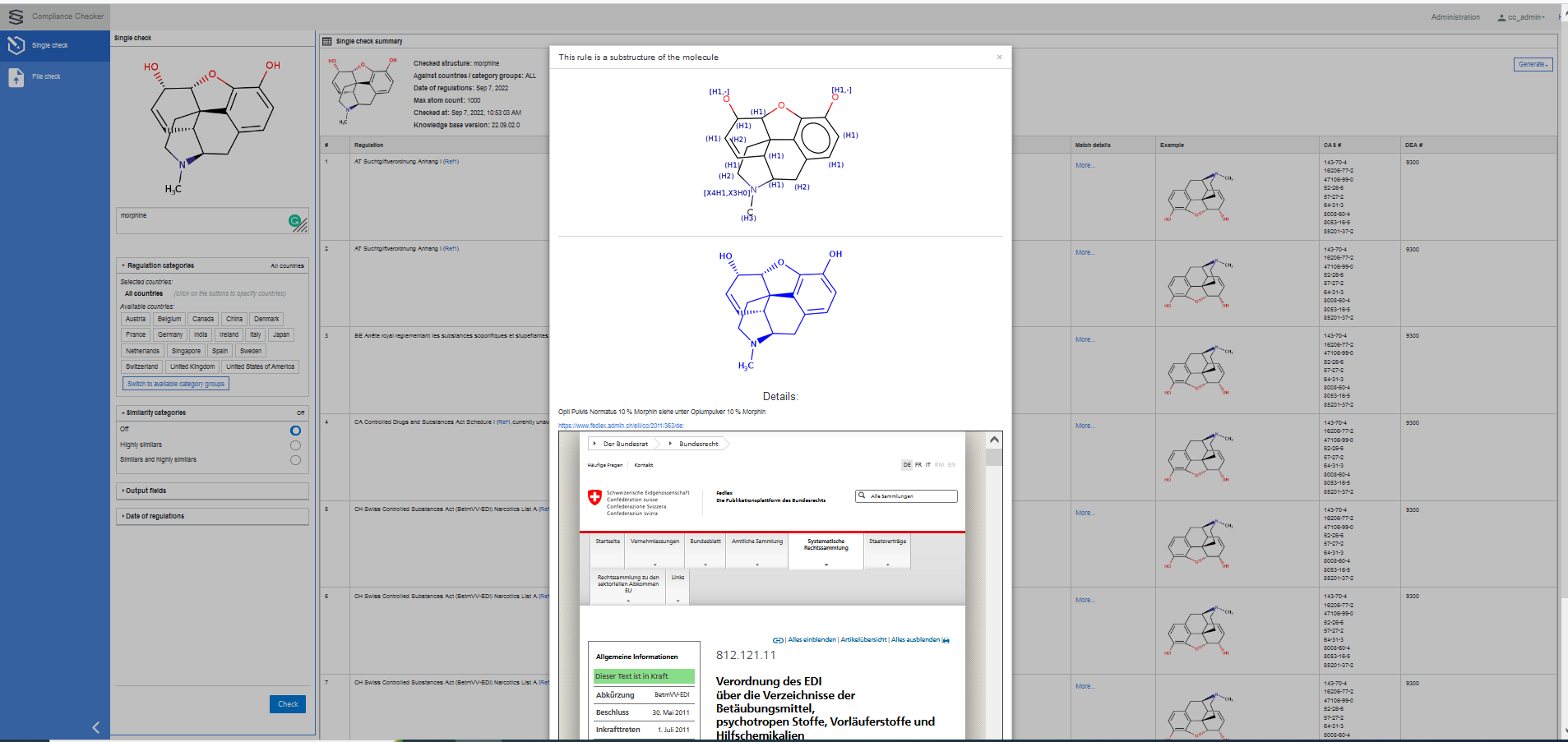| Match details | * More.. . * opens a popup to display the query structure applied to hit the checked substance and the details of the matching regulation or shows the similarity category |