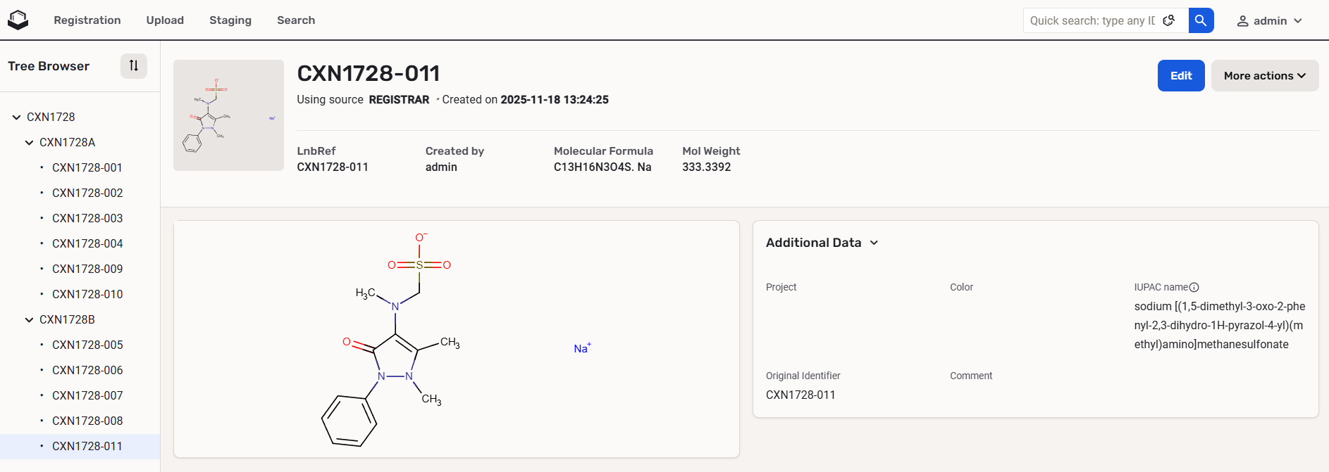 This page visualizes the entire tree for a given compound: parent, version and lot levels. The tree can be configured in a way to display the parent and lot levels only (version level being ignored). At the top of the structure hierarchy the parent standardized form of a compound is displayed. On the next level all versions of the above parent containing isotopes, charges and salt/solvates are shown. The lot (or preparation) level represents the unit of material obtained in one definite chemical process, defined by unique external IDs is at the bottom level of the hierarchy. The tree-like visualization of the Browse page is a direct representation of the storage hierarchy.