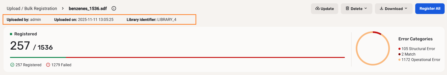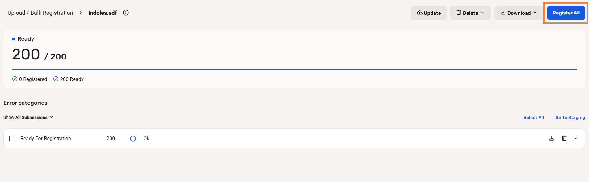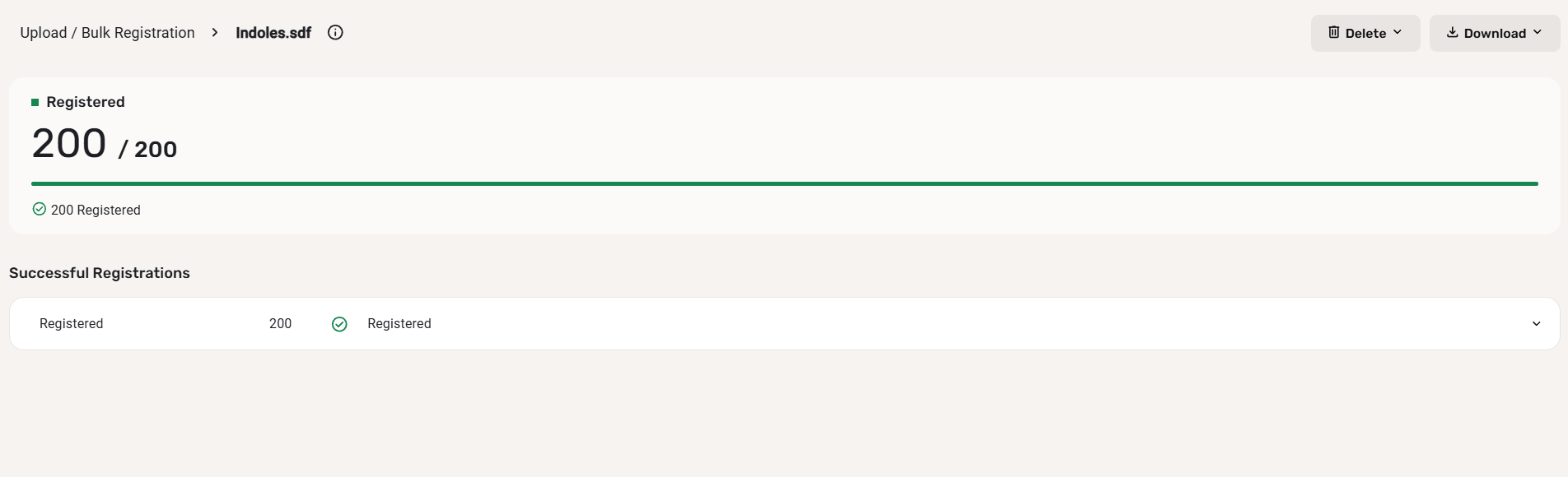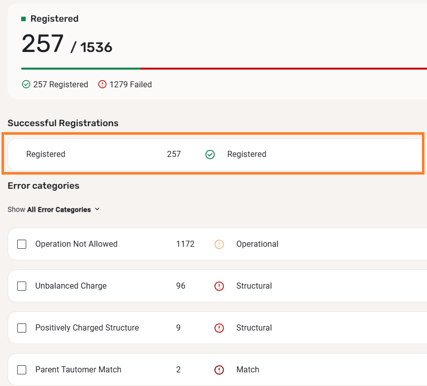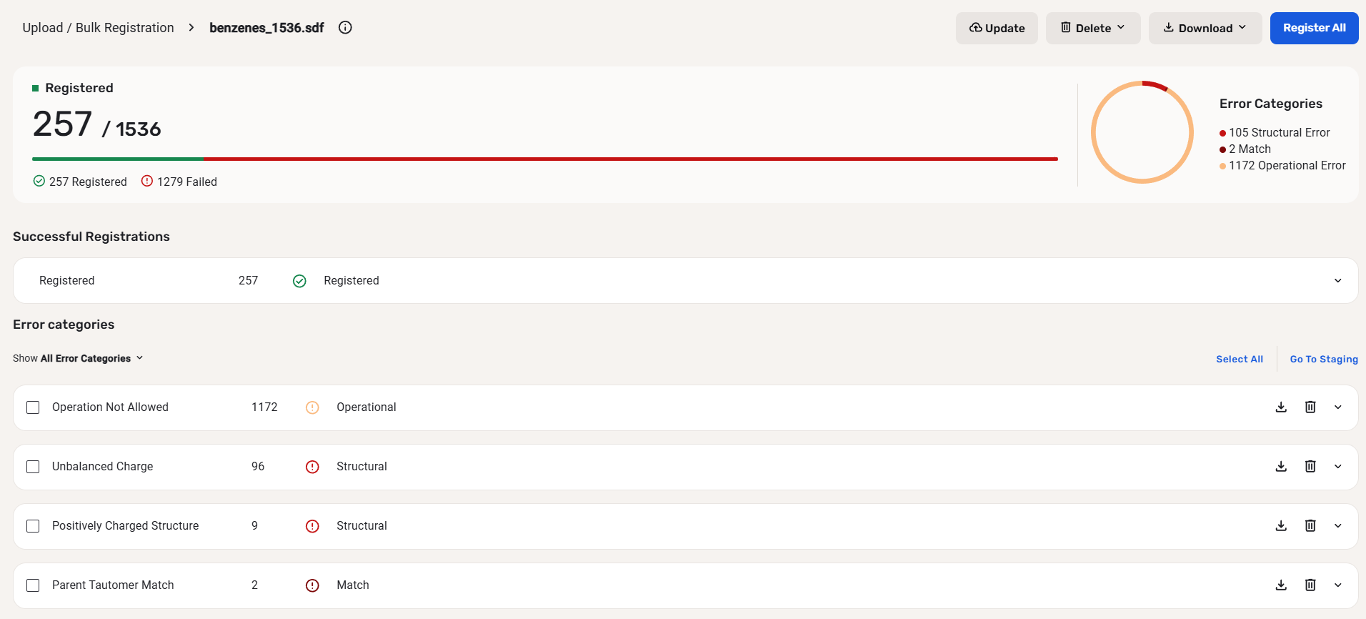 In case when a regular bulk upload process is made the successfully registered compounds appear in the Registered category.