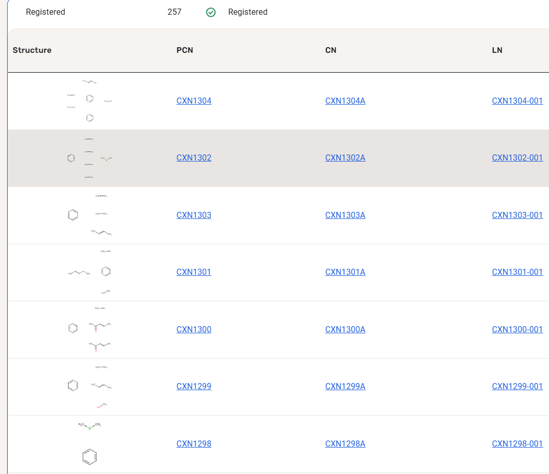 The list of successfully registered compounds is paginated and contains all relevant Ids (PCN, LN, LnbRef, and CN-configurable) and the info whether the compound was a newly registered one or not.