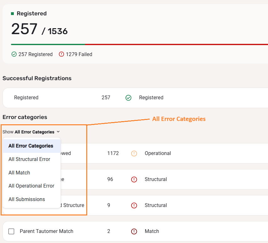 The failed submissions are displayed categorized by error type. The erroneous submissions are categorized by the following types: operational, structural and match. A donut chart (Figure) represents the submission distributions according to the error type.