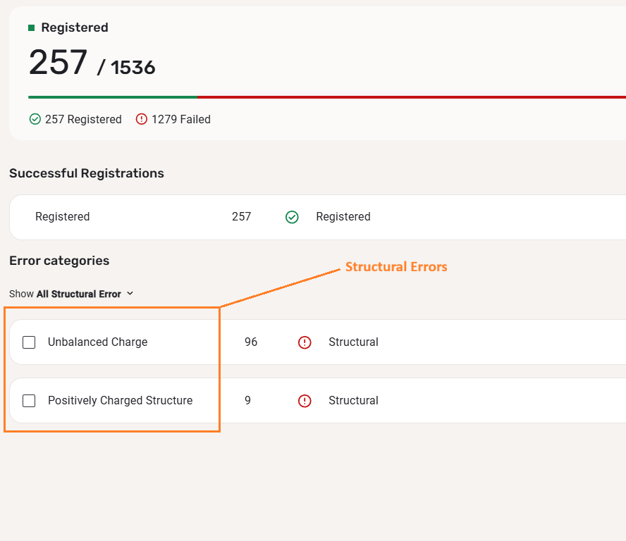 The upload report in PDF contains all items from the uploaded SDF with all the relevant info. The registered structures appear in the first section of the PDF, the failed ones are after.