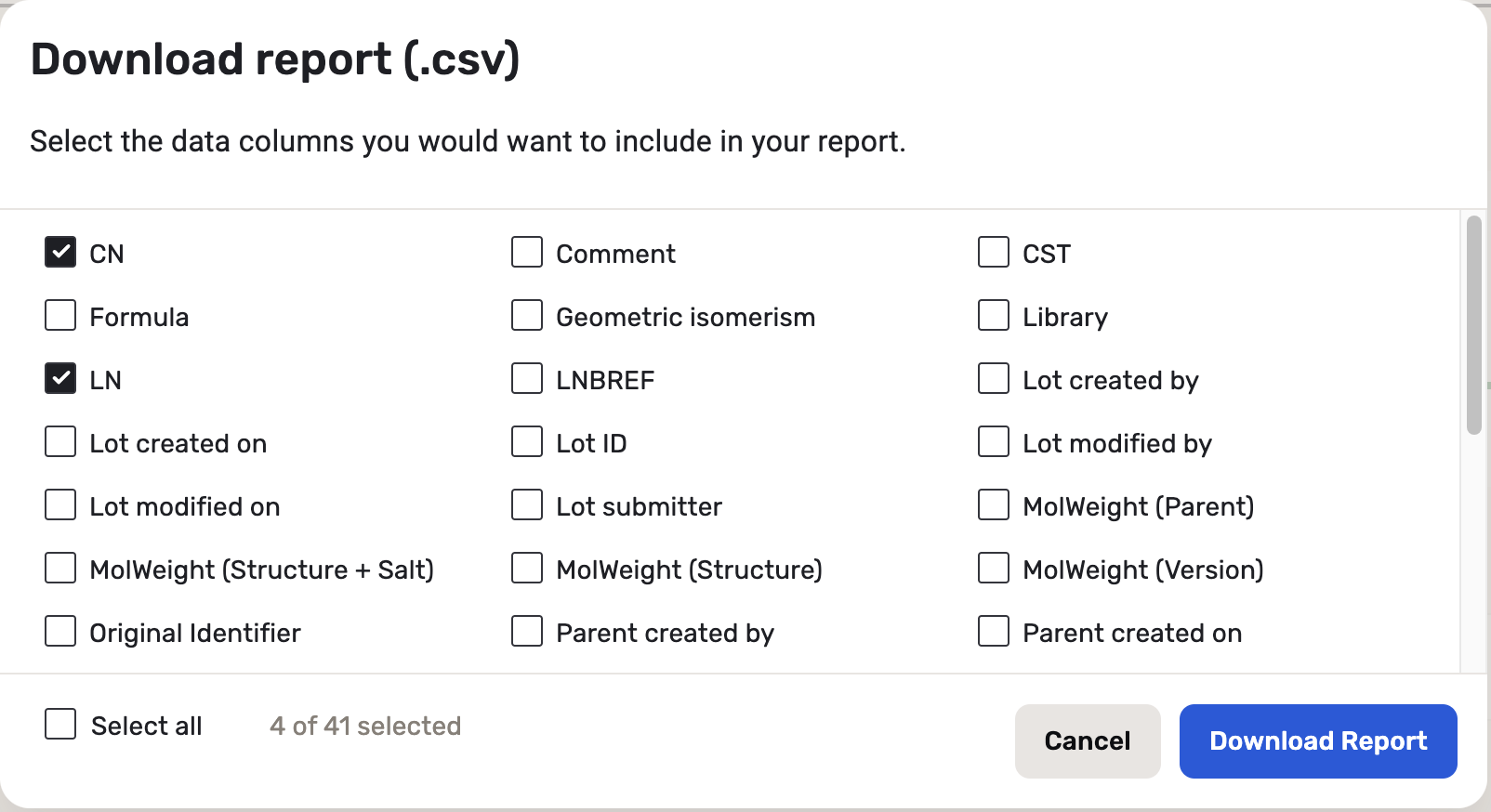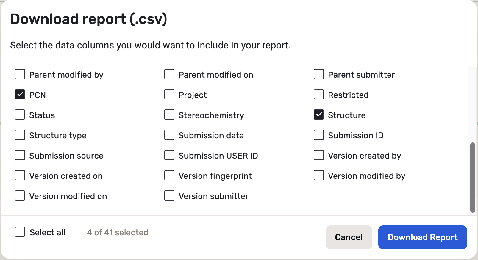 The default columns are structure, PCN, CN and LN. The ‘column setting’ is saved per user, it persists even after logging out. Once the columns are set, the downloaded SDF will appear accordingly. The structure field can be turned off, in which case an empty field will be present in the CSV.