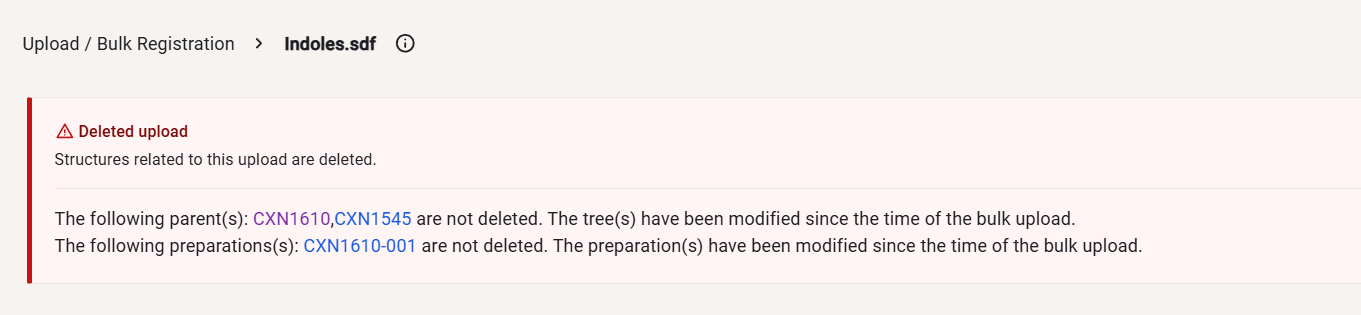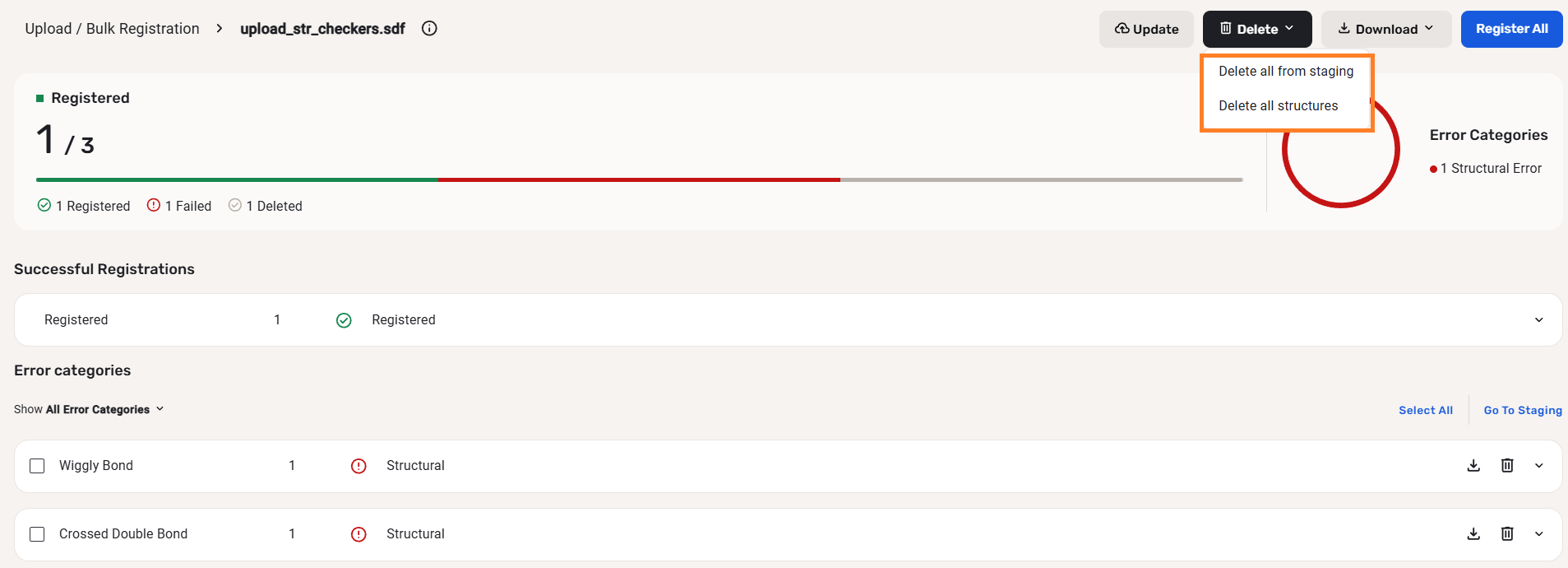 With the help of this function you can delete all submissions from staging and all registered structures that were created during this bulk upload. Registered structures can be only deleted if they were not modified since the upload.