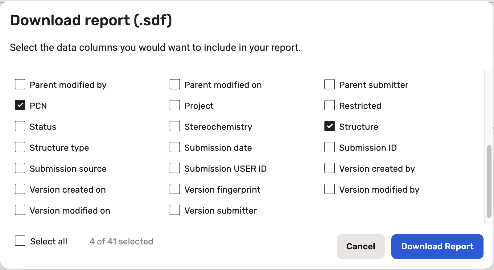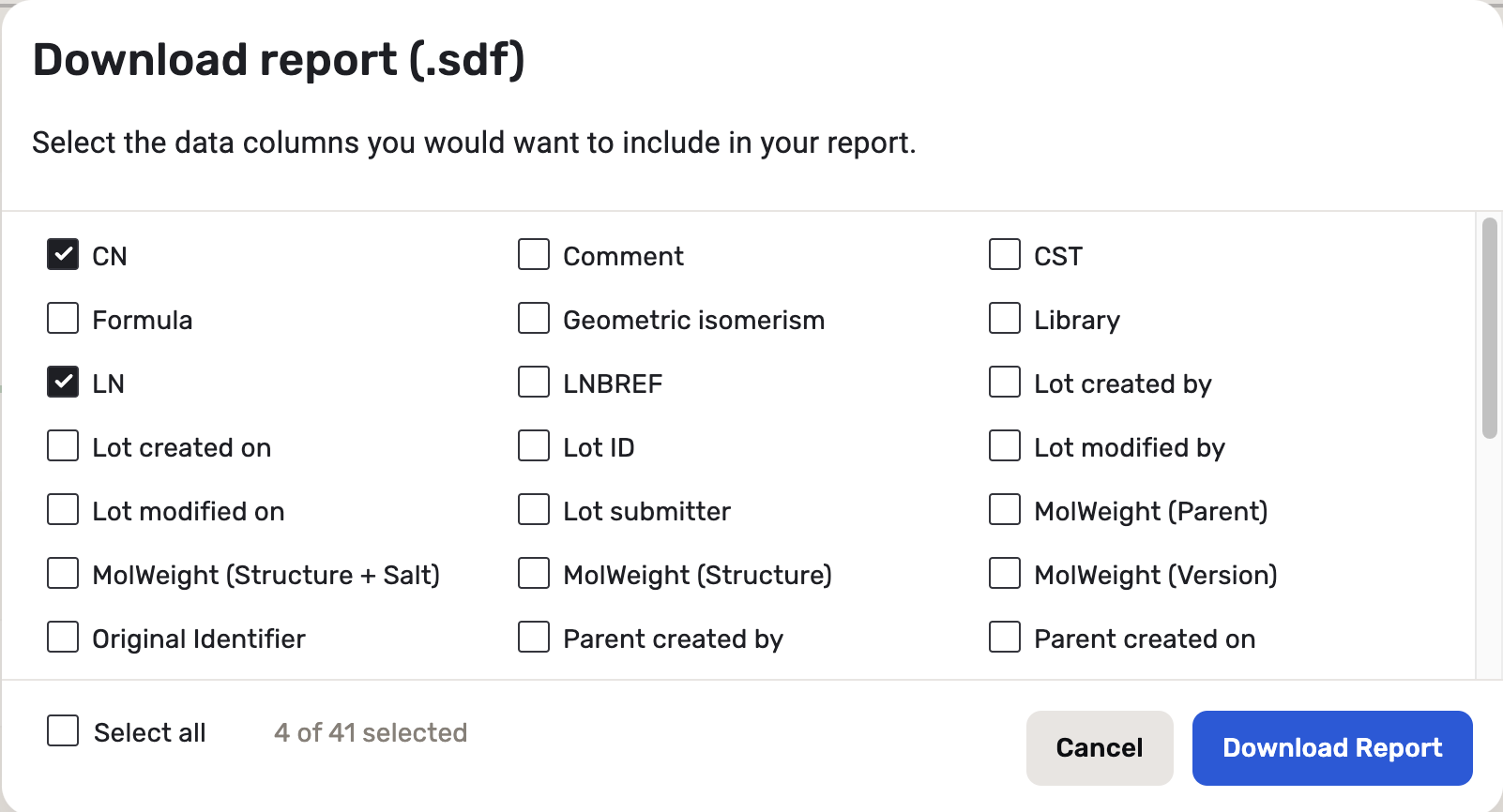 The default columns are structure, PCN, CN and LN. The ‘column setting’ is saved per user, it persists even after logging out. Once the columns are set, the downloaded SDF will appear accordingly. The structure field can be turned off, in which case a “No structure” will be present in the SDF.