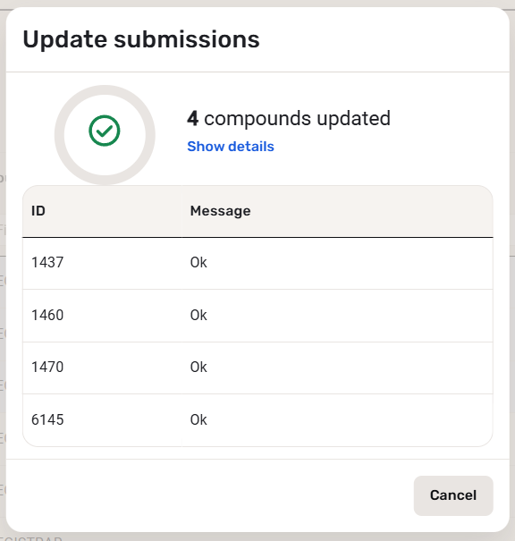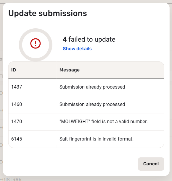The user can easily download one or all the problematic structures and fixed them locally and then re-upload them with the update option, and register the whole uploaded set without errors. The update process performed based on matching submission IDs, in case of non-matching submission ID, the update attempt will be ignored. When the update is finished the number of successful and ignored structure updates appear.