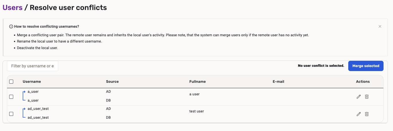 Conflicted usernames are marked in the list of users on the Users page. An exclamation mark can be seen next to these usernames and a 'Conflicted usernames are detected' banner can be seen above the list with a button for Solve conflicts.