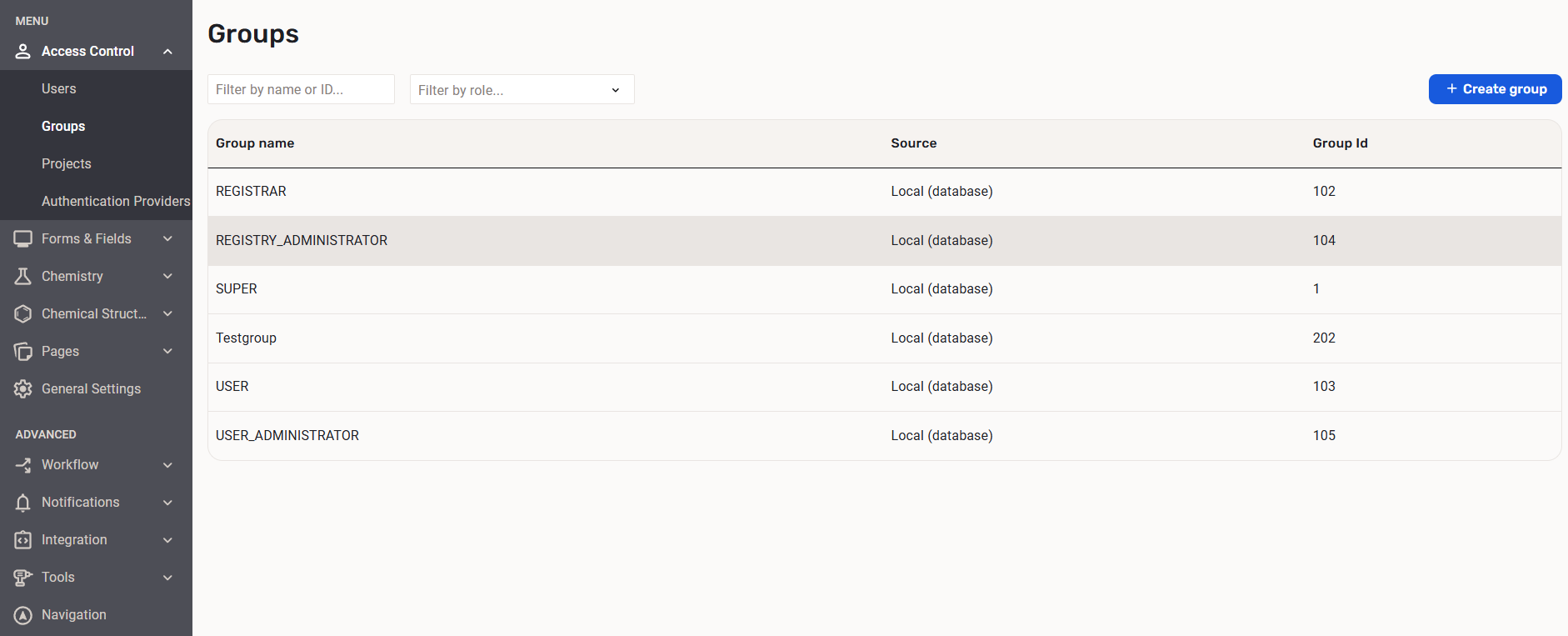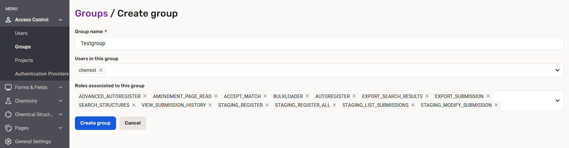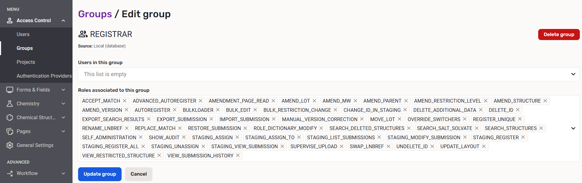 For example, for a user to be able to register a compound, it needs to have the AUTOREGISTER or the ADVANCED_AUTOREGISTER role. Predefined groups associated with this role are the USER and the REGISTRAR groups. For more information on roles visit this page.