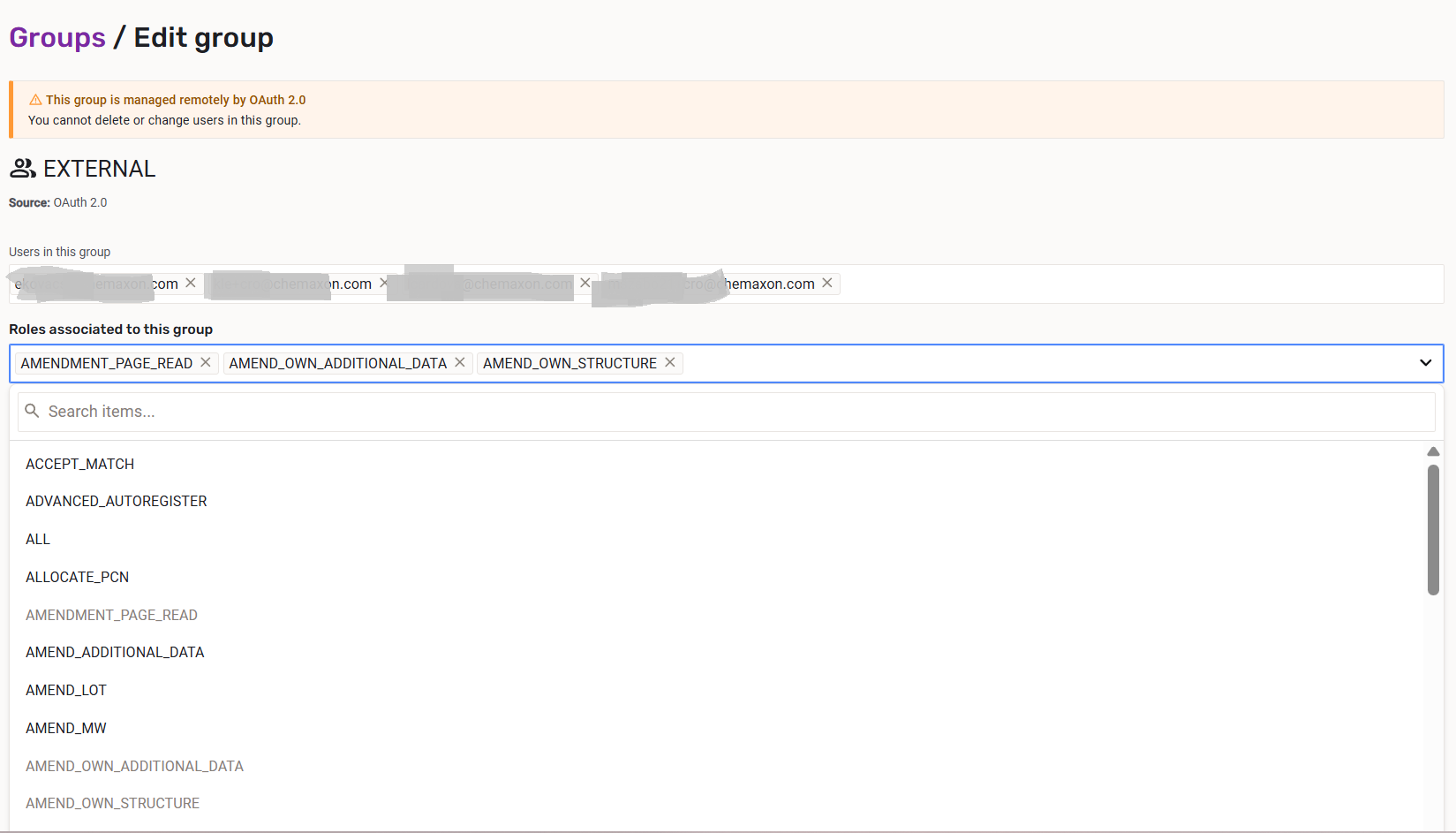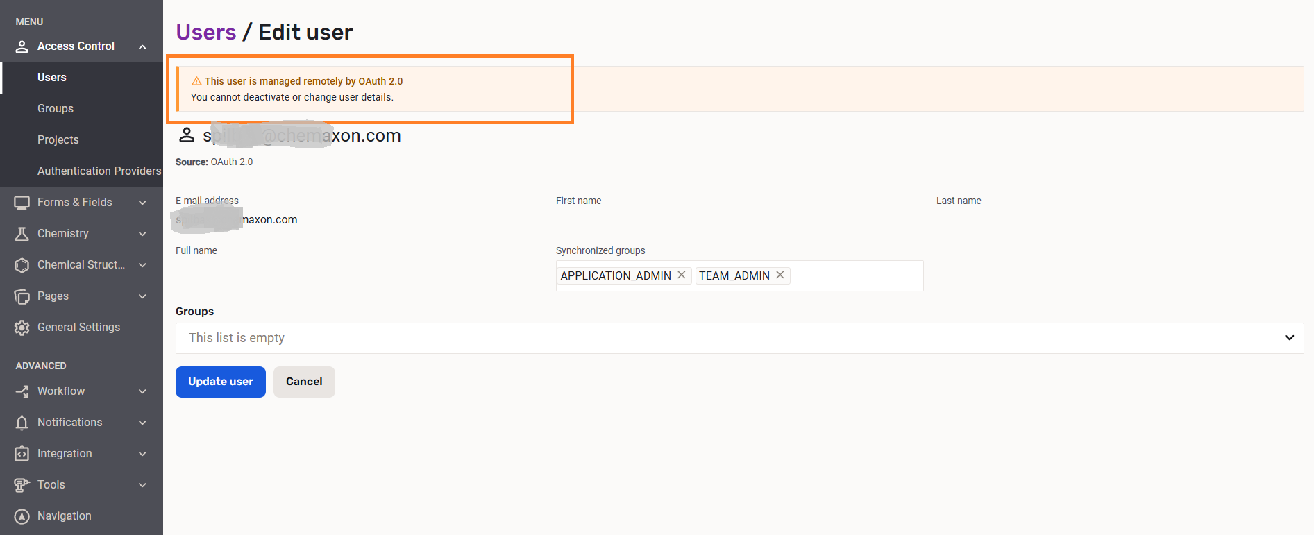 In case of remote users (AD/LDAP/SAML) the e-mail address, first name, last name, full name, and remote groups will be synchronized with Compound Registration if it is configured (Authentication), therefore these properties are not editable for a remote user. The only thing that is allowed for remote users is to manage its local groups.