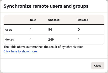 New: Newly created remote Groups are counted here. After clicking on the Synchronize button again these will be counted as updated groups.