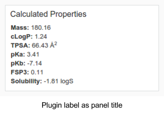 The plugin template is an HTML fragment that’s injected into the plugin panel of single compound view or spreadsheet view. Data provided to the template is described below. |