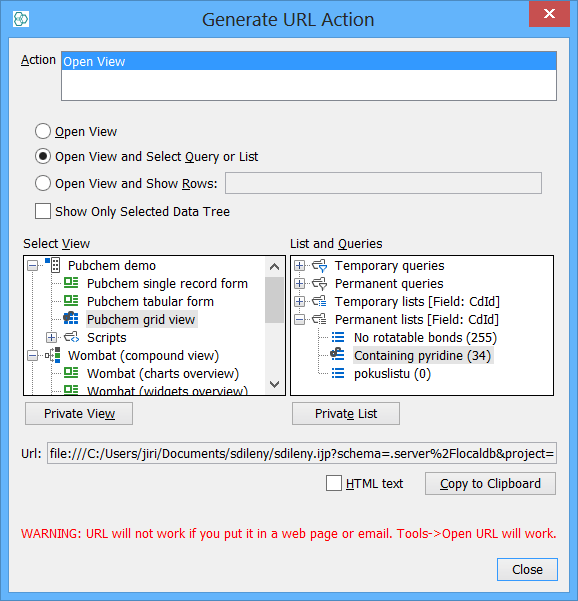 The generated URL is displayed at the bottom of the dialog. It can be generated in HTML format for pasting into a web page by checking the 'HTML text' checkbox. Access the URL by clicking on the 'Copy to clipboard' button and then paste it wherever you need.