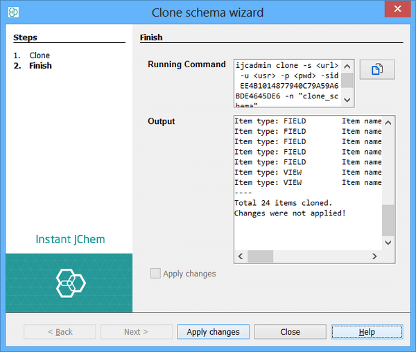 This operation can be performed with exactly one schema selected. When one schema from the schema list is selected and clone operations is clicked, the clone wizard is started and source connection with source schema are prefilled and are not editable any more. Only thing that is editable in this wizard is new schema name. It depends on user how he wants new cloned schema to be called.
